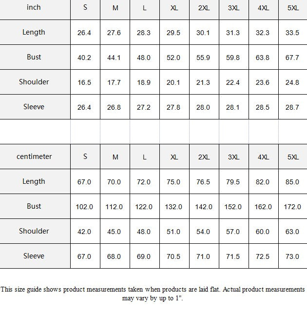 inch | S | M | L | XL | 2XL | 3XL | 4XL | 5XL |